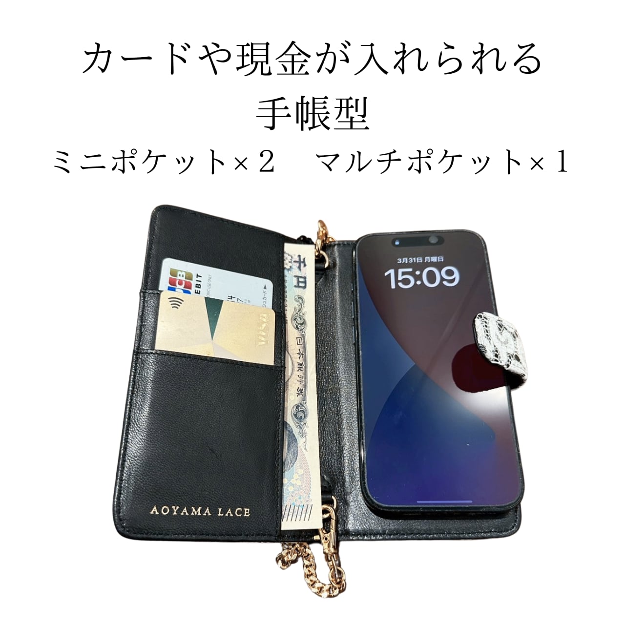 フランス製最高級リバーレースと上質な小羊革のコンビネーションが美しく、醸し出される品の良さと優しさを感じられるスマートフォンケースになります。